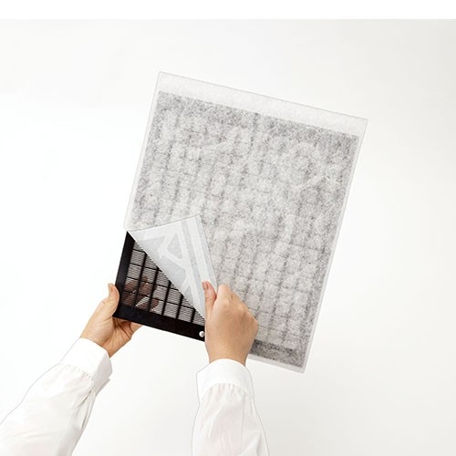コンパクトなサイズで貼りやすく、ほとんどのレンジフード機種に対応できる優れものです。金属フィルターを外して手元で貼れるため、取り付けがラクになるのも大きなポイント。さらに、交換時期を知らせる「交換お知らせサイン」でとりかえタイミングがわかりやすいです。