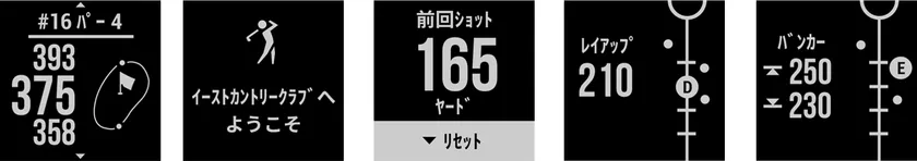 左から距離計測、コース選択、ショット飛距離計測、レイアップ表示、ハザード表示