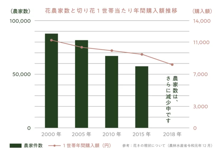 2000年以降続いている花需要減少により、花農家数・一世帯あたり花購入額共に、平成のピークに比べ35%減少(花農家数:2000年と2015年を比較、花購入金額:1995年と2015年を比較)しています。
