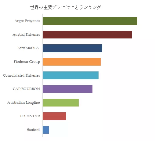 本レポートでは、SAPMER; Argos Froyanes; Austral Fisheries; EstreMar S.A.; Fiodosur Groupといったトゥースフィッシュの主要企業を紹介している。2022年、トゥースフィッシュの世界シェアは上位5社で42%を占める。上図は、トゥースフィッシュにおける主要プレイヤーの売上高ランキングである。