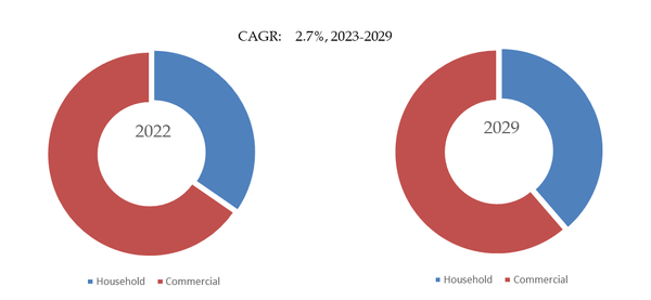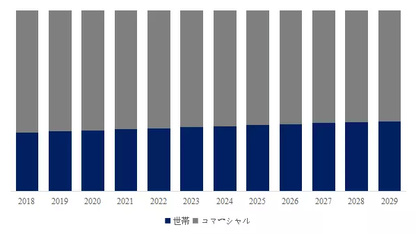 製品の用途別では、商業用が最大の用途で、65.4%のシェアを占めている、