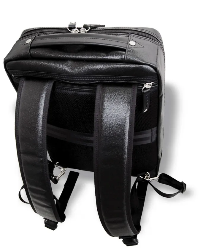 機能だけではなく、ビジネスらしくシンプルなデザインではありながらも、森野帆布生地の持つ独特の艶感と漆黒というに値する深味のある黒色と、森野帆布鞄のアイコンとなっている船具金具「シャックル」が、大人のビジネスリュックスタイルをよりスタイリッシュに完成させてくれます。