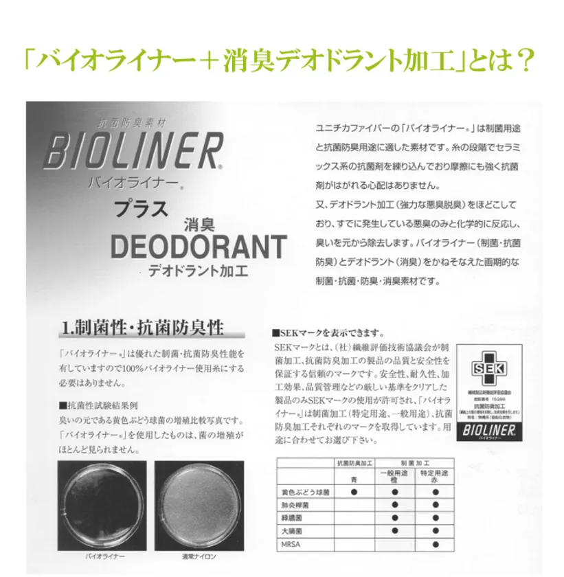 こちらは内部全面にユニチカ株式会社 抗菌消臭素材「バイオライナー+デオドラント加工」を使用しています。