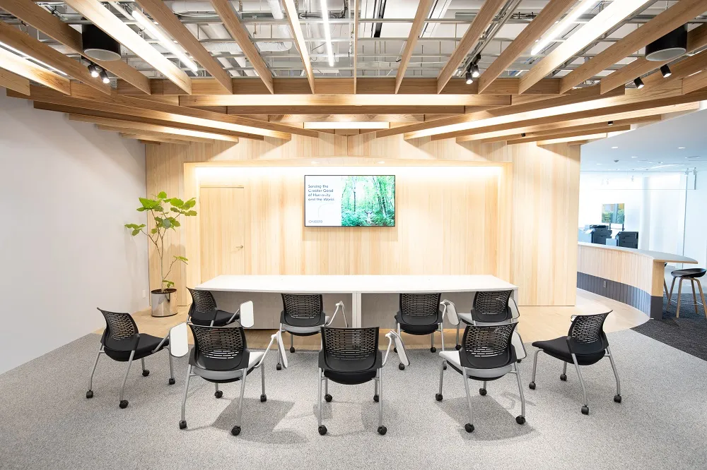 当社は、世界140カ国以上で事業を展開しており、今回オープンした「ナレッジプラス大阪」は、多くのお客様やパートナーとグローバルに繋がり、情報や知識を受発信する新しい形のショールームです。多くの企業がテレワークを導入する中、「ナレッジプラス大阪」も、直接お客様にお越しいただくだけでなく、バーチャルでコミュニケーションを展開できるよう、様々な使用用途に対応しています。「柔軟性」をキーワードとし、レイアウトを固定化させずフレキシブルな空間としており、これまでのショールームの枠にとらわれない、自由な発想で情報を受発信できる情報発信拠点を目指して創ったのが「ナレッジプラス大阪」です。