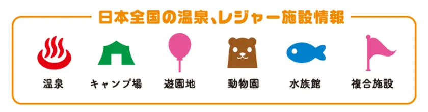 全国各地の「温泉、キャンプ場、遊園地、動物園、水族館、複合施設」が6種類のマークで表示されます。