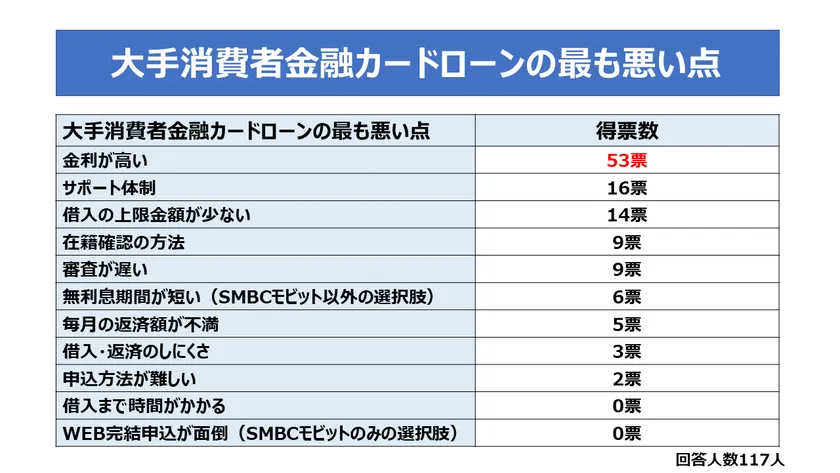 いっぽう、大手消費者金融カードローンの利用者に、「大手消費者金融カードローンの最も悪い点」を回答してもらったところ、回答者の45.3%にあたる53人が「金利が高い」と回答。