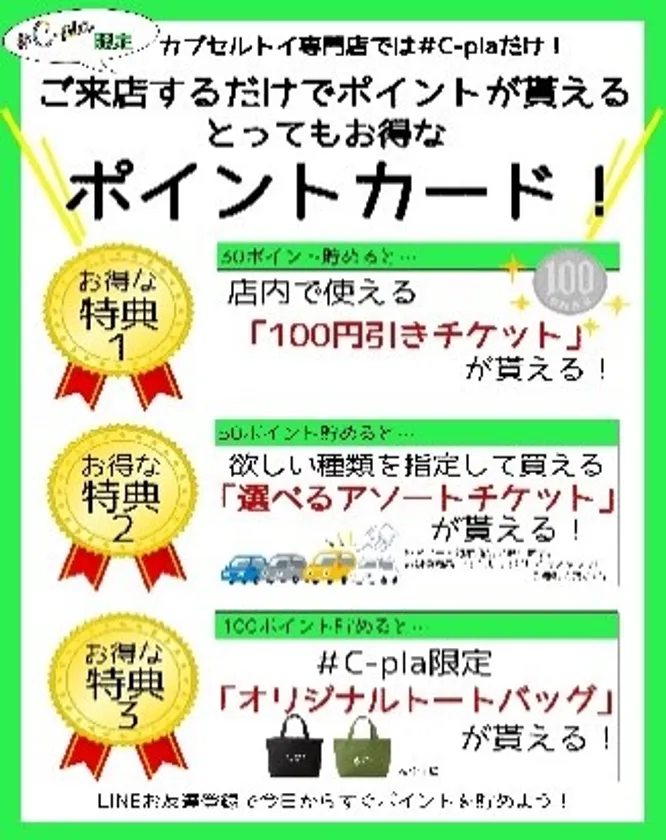 #C-pla公式LINEに友達登録するとショップカードが発行され、ガチャガチャ専門店では初となる“来店するだけで1日1ポイント”が付与される。30ポイントで「100円引きチケット」50ポイントで欲しい種類を指定して買うことができる「選べるアソートチケット」など、お得な特典が受けられるサービスをご用意。
