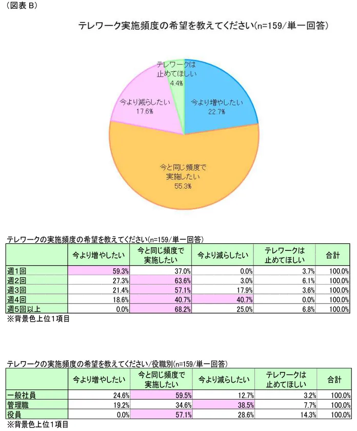 役職別にみると「一般社員」と「役員」においては「今と同じ頻度で実施したい」(同各59.5%、57.1%)が最も多く、「管理職」においては「今より減らしたい」(同38.5%)が最も多い結果となり、管理職層においてはテレワークに消極的な様子が表れています。(図表B)