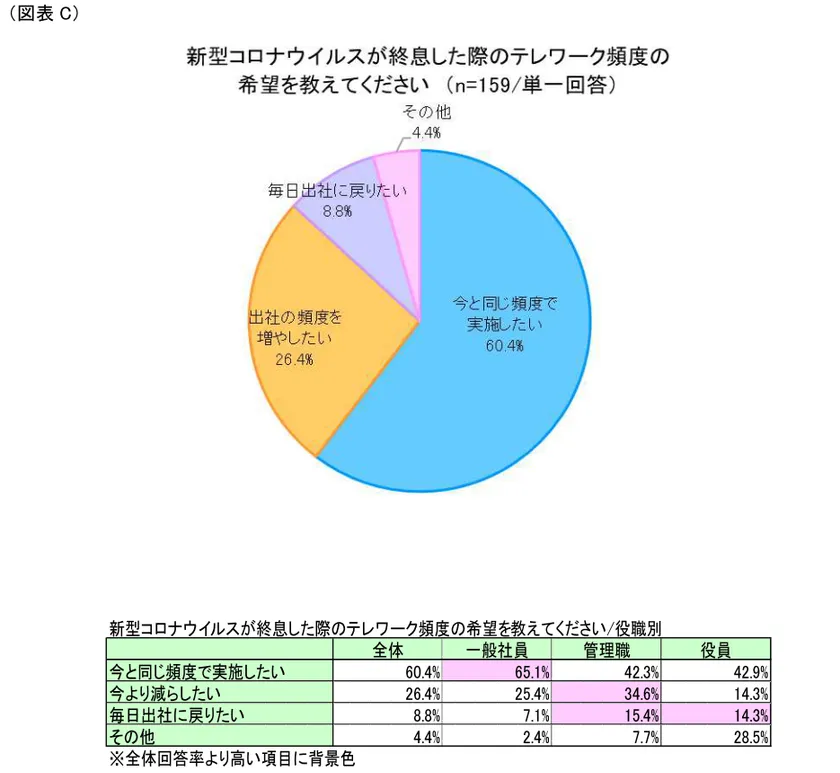 役職別では「今と同じ頻度で実施したい」において一般社員(同65.1%)のみが全体(同60.4%)を上回っており、「毎日出社に戻りたい」においては管理職(同15.4%)、役員(同14.3%)が一般社員(同7.1%)の倍となっているなど、一般社員と管理職以上との間ではテレワークに対する積極性に差が見られる結果となりました。(図表C)