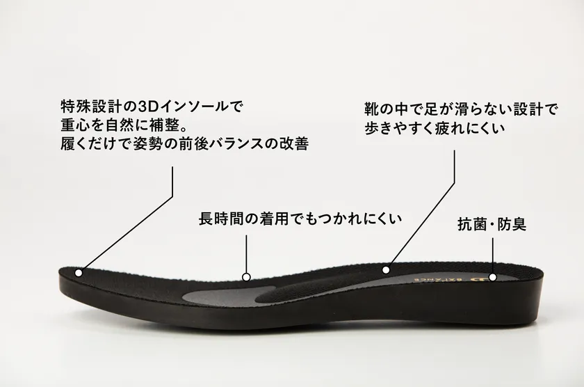 また、レディースシューズとして「ボディバランスインソール」を搭載した靴は、これまで累計2万足以上販売している大ヒット商品です。なお、一定期間ボディバランスシューズを着用することで、着用時並びに裸足の姿勢のバランスが改善されるという結果が東京大学との共同研究で実証されています。
