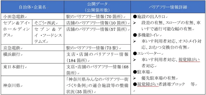 神奈川県および同県とSDGs推進協定を締結している小田急電鉄株式会社、株式会社セブン&アイ・ホールディングス、京浜急行電鉄株式会社、株式会社横浜銀行に加え、株式会社東日本銀行、株式会社そごう・西武、株式会社セブン&アイ・フードシステムズが持つ駅や店舗等施設の多機能トイレの情報やエレベーターの情報を整備し、歩行者移動支援サービスに関するデータサイトにてオープンデータとして公開しました。