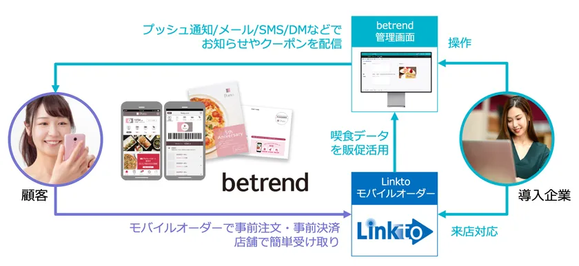 モバイルオーダー機能は、セイコーソリューションズ株式会社(本社:千葉県千葉市、代表取締役社長:関根 淳、以下 セイコーソリューションズ)が提供する『Linktoモバイルオーダー』を採用しています。『Linktoモバイルオーダー』と『betrend』は、システム連携しており、『Linktoモバイルオーダー』の喫食情報(注文内容や金額など)に基づいたきめ細やかなCRM施策を実施することができます。今後、『betrend』のスマートフォンアプリに配布したクーポンを『Linktoモバイルオーダー』でも使用できる機能など、連携機能を順次追加していく予定となっています。