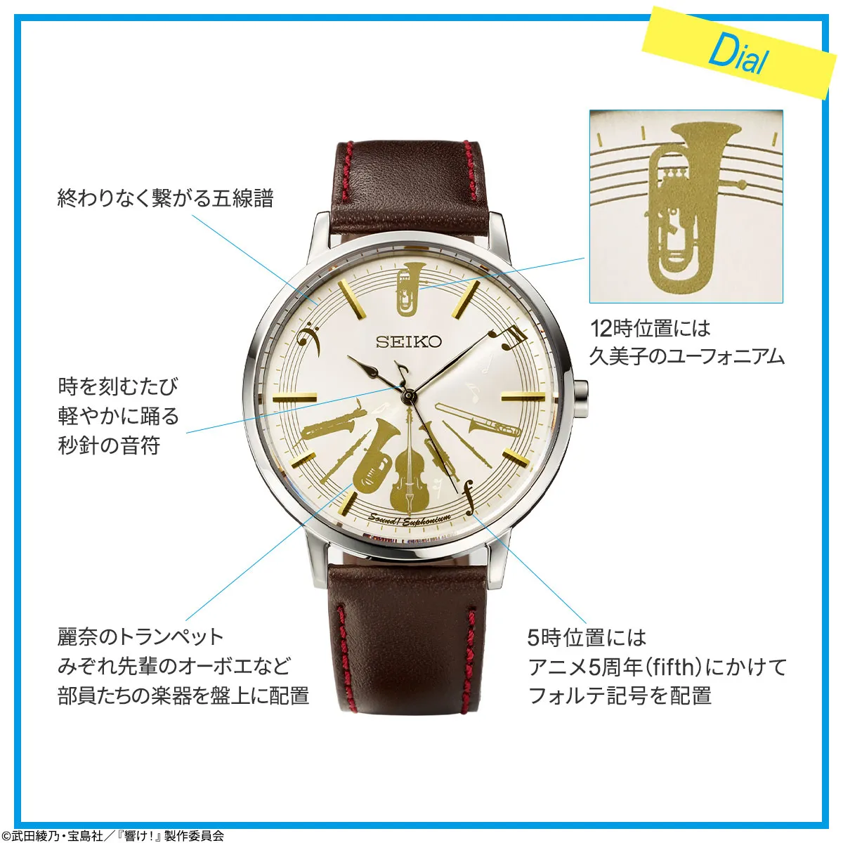 文字盤には、終わりなく繋がる五線譜をデザイン。そこに久美子のユーフォニアムや麗奈のトランペット、緑輝のコントラバス、葉月のチューバ、みぞれ先輩のオーボエなど、部員たちの楽器を配置しました。その上を秒針の音符が軽やかに時を刻みます。