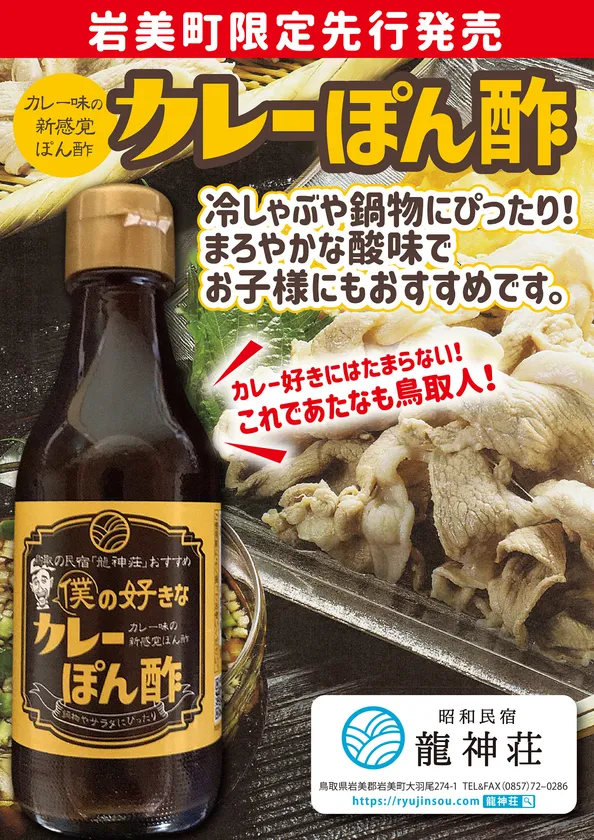 龍神荘(所在地:鳥取県岩美郡、代表:間淵 武志)は、『カレーぽん酢』を2021年4月10日に鳥取県岩美郡岩美町内のみで先行発売いたします。