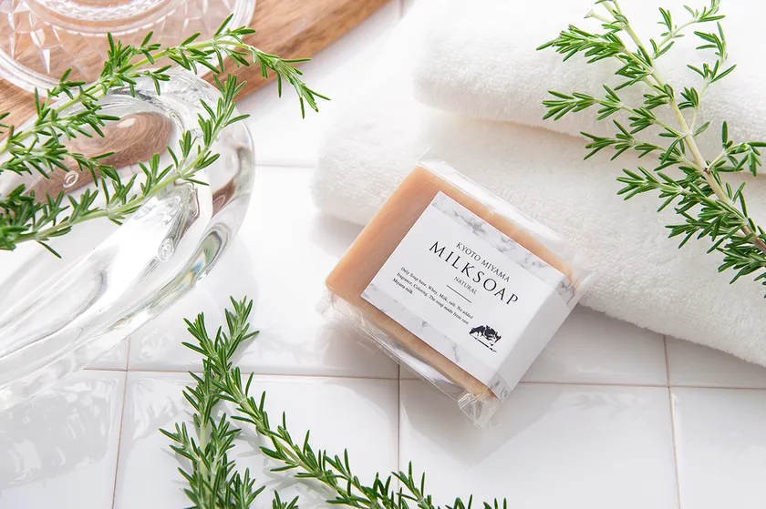 かやぶきの里として知られる京都府美山町。その地でわずか2軒の酪農家が手がける貴重な生乳を使って、特産の「美山牛乳」と「美山チーズ」は作られています。貴重な生乳から美山チーズを作る過程で生まれる栄養価の高いホエイ(乳清)ですが、これまではすべて廃棄されていました。ホエイには美容成分が豊富に含まれていることから、その特性をなんとか活かしたいと考えるうち、せっけん作りに必要な水の代わりにホエイを用いることを思い立ちました。さらに牛乳を加えるなど、試行錯誤を重ねながらついに、理想的な高保湿せっけんが完成しました。