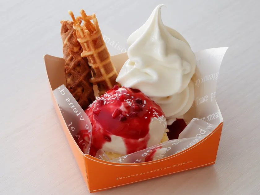 白い恋人のチョコレートと道産牛乳を合わせた「白い恋人ソフトクリーム」に美冬の季節限定レモン味、北海道の雪をイメージしたキラキラと輝くシュガーをトッピングしたサンデー。