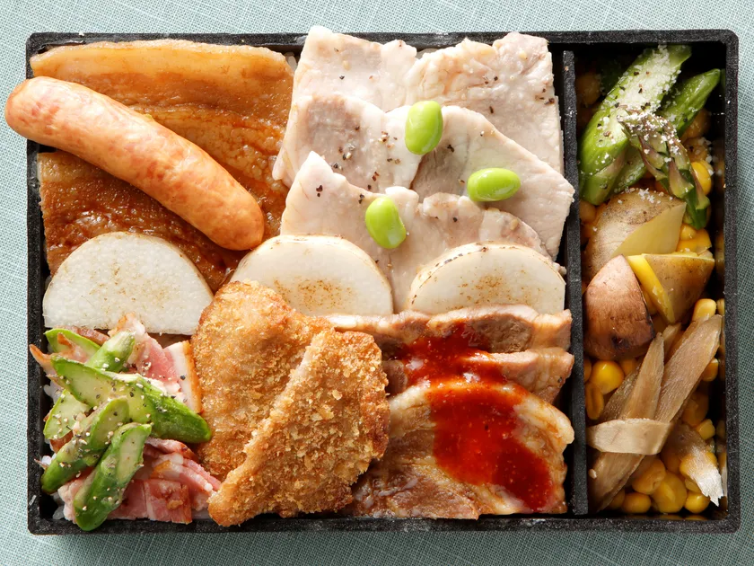 十勝産桃花豚のバラ、ロース、肩ロースを塩・甘辛・たれの3種類で味付け。アスパラをはじめ、とかちマッシュや春掘りインカなど道産の野菜も楽しめる弁当。