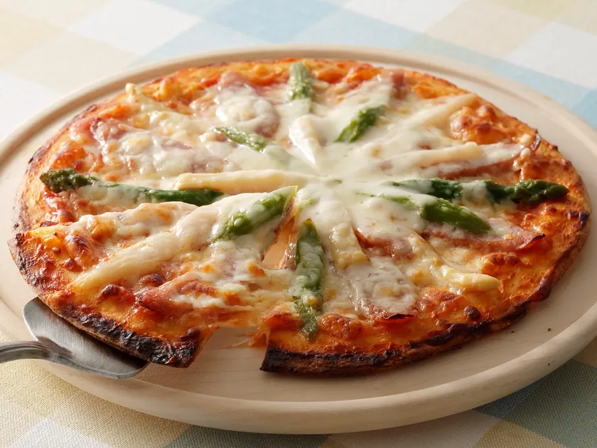 グリーンアスパラとホワイトアスパラの2種の風味が楽しめるピザ。