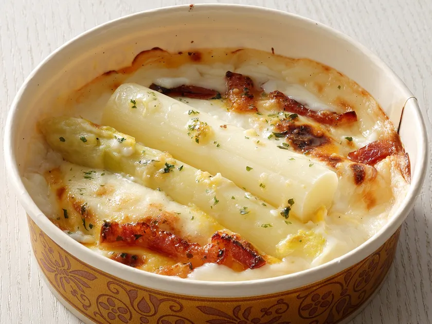 厳しい寒暖差によって、甘くみずみずしく育ったホワイトアスパラの旨味がたっぷりのグラタン。