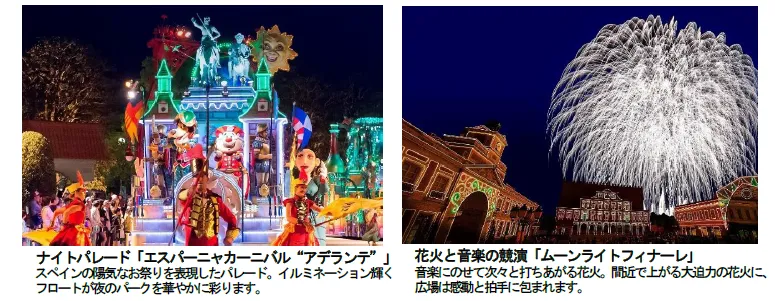 志摩スペイン村では、「スプリングフィエスタ」のフィナーレを飾る4 月29 日(木・祝)~5 月5 日(水・祝)の間、ナイター営業を実施いたします。きらびやかなナイトパレードや大迫力の花火が、夜のパークを華やかに彩ります。さらに、16 時以降お得に楽しめる「ムーンライトパスポート」を販売します。
