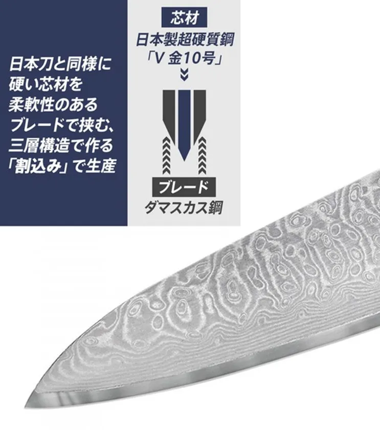 包丁の切れ味を左右する芯材には日本製の超硬質鋼「V金10号」を採用。V金10号は錆を防ぐためレアメタルのコバルトを含んだ特殊鋼で、錆に強いばかりかステンレス鋼の硬さを示すロックウェル硬度では超高硬度に当たる61HCRを達成。