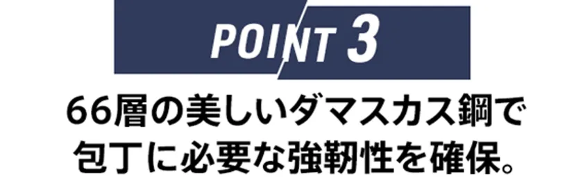 「ダマスカス67」のブレードは木目のように何層にも折り重なって見える美しいダマスカス鋼を採用しました。日本刀が折れないのは、刃の両脇に柔らかく粘り強い軟鉄を用いているから。堅い芯材は横からの衝撃には脆く、軟鉄に挟んでその脆さを補完します。包丁も同様で芯材を両脇から柔らかい金属で挟んで、芯材に掛かる負荷を分散し刃こぼれを防いでいます。「ダマスカス67」はV金10号の芯材を挟む素材に高品質なスウェーデン製のダマスカス鋼を採用。