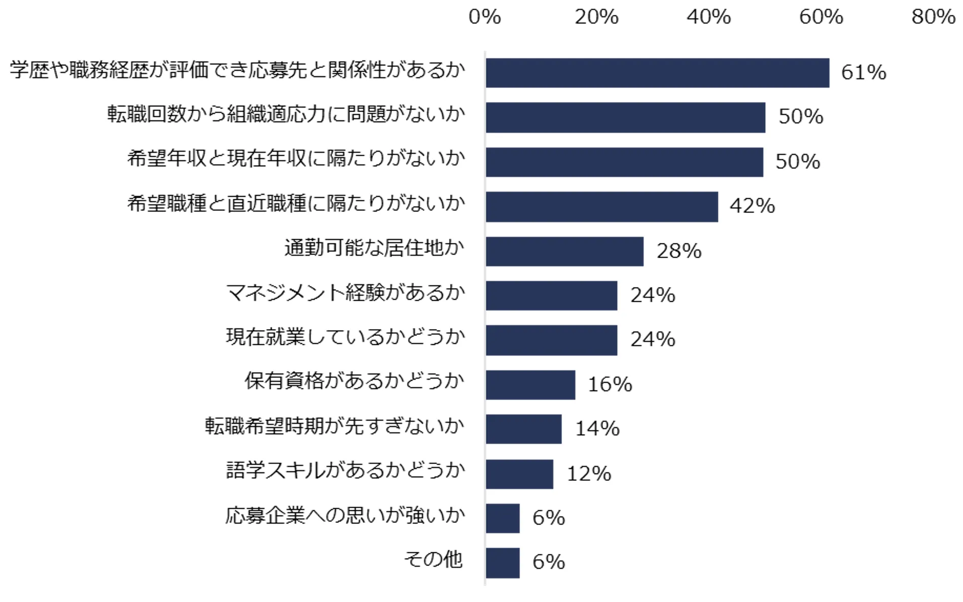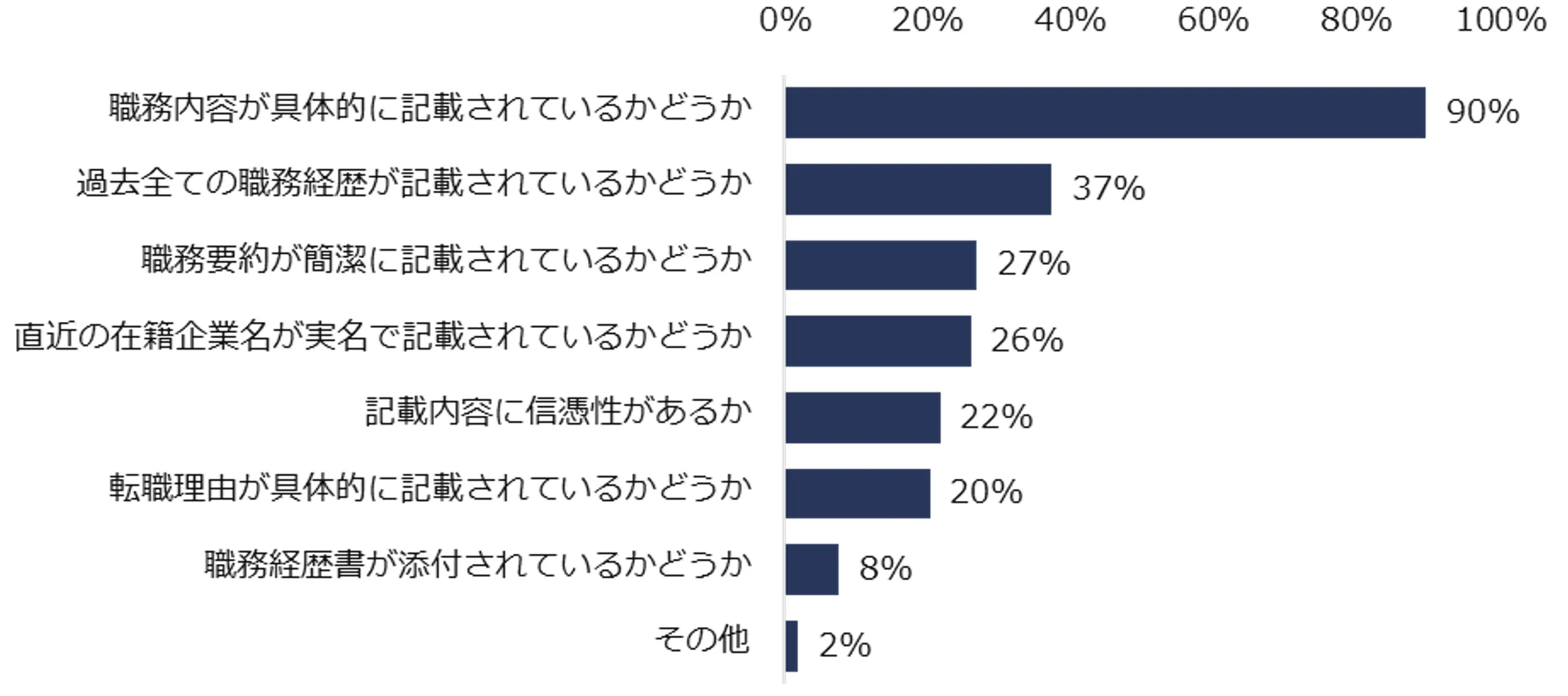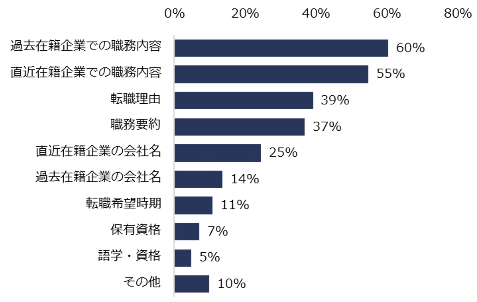 2:特に不十分だと感じる項目トップ3は「過去在籍企業での職務内容」「直近在籍企業での職務内容」「転職理由」。(図2)