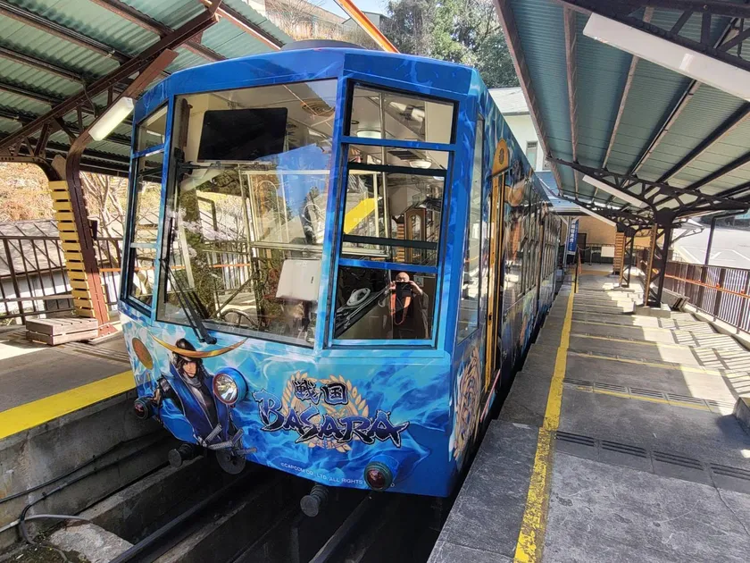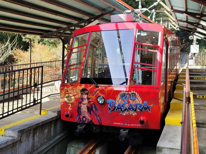 比叡山と滋賀のスタンプラリースポットを繋ぐ坂本ケーブルでは、「戦国BASARA」ラッピング列車とも連携企画として運行中。数量限定乗車券も販売しております。「戦国BASARA」伊達政宗の声優、中井和哉さんによる車内案内放送もお楽しみ頂けます。