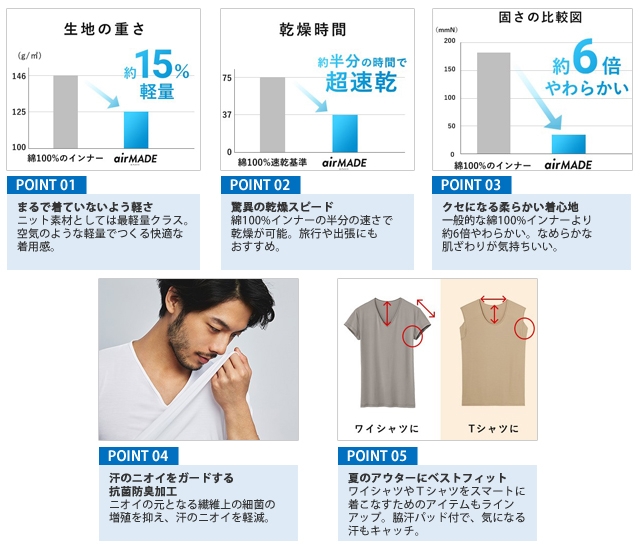 本商品は、「軽さ」「吸汗・速乾性」を追求して独自に開発した素材により、ニット素材としては最軽量クラスの軽さと、綿100%インナーに比べて半分の速さの乾燥を実現。汗をかいてもさらさらした着心地に加え、一般的な綿100%インナーに比べて6倍のやわらかさで、まるで着ていることを感じないような心地よさを生み出した新感覚のストレスフリーインナーです。ベーシックなクルーネックTシャツなどに加え、絶妙なネックラインと袖丈がYシャツスタイルにおすすめのVネックTシャツや、襟元から見えないように広めのネックライン設計でTシャツスタイルにぴったりのUネックスリーブレスなどアウターをスマートに着こなすためのアイテムもラインアップ。どちらも脇に汗取りパッドを付けているので気になる汗も吸収します。アウターに合わせてインナーを選ぶことが当たり前になった今、着心地、デザイン、機能にこだわった「air MADE」で、もっとここちよく、そしてスマートに過ごしてみませんか。
