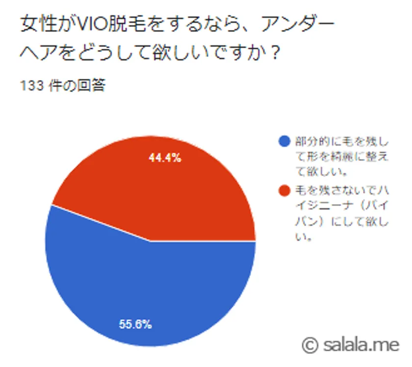 毛を残さないでパイパンにして欲しい!(是非、ハイジニーナにして欲しい!)と答えた男性が全体の44%もいる(約半数の男性はハイジニーナが好き)