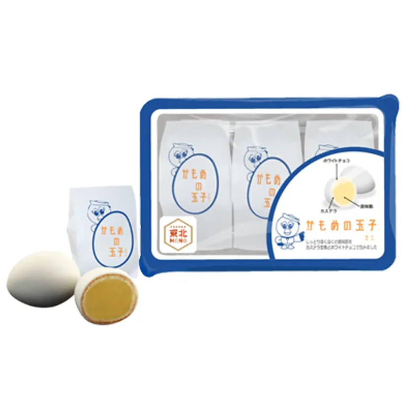 しっとりホクホクの黄味餡をカステラ生地で包み焼き上げホワイトチョコでコーティングした卵にそっくりなお菓子です。東北MONOオリジナルロゴシールパッケージ。数量・店舗限定