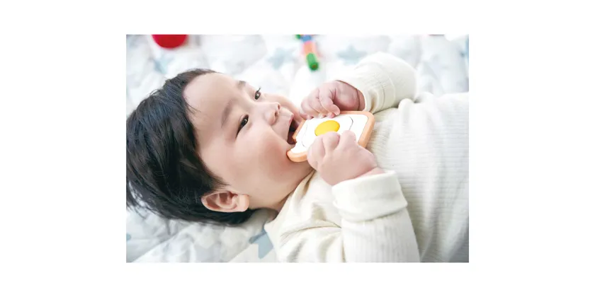 朝ごはんの定番「トースト」が歯がためになりました。茶・クリーム・白・黄色、様々なカラーを使用しているため、赤ちゃんの視覚もにぎやかに。柔らかさは2種類。パン耳はふつう、中身は柔らかく仕上げました。噛むところによって刺激が変わってくるので、噛み心地に変化が付くように工夫されています。裏面にはワンポイントのニコちゃんマークがついているので、裏面を表側にして噛んでいてもかわいい写真が撮れます。