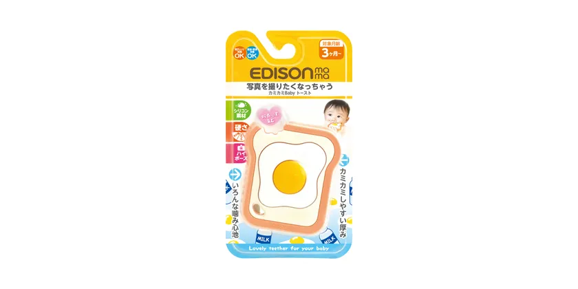 また、エジソンママの 歯がためシリーズは累計販売数250万個以上突破!多くのママ・パパから「くわえた姿が可愛くてたまらない」とお声をいただいております。今回その大人気シリーズに新デザインが仲間入りしました。モチーフは「トースト」と「サボテン」を採用。どちらも当社独自のママ・パパのモニターから意見をいただき、商品開発をする上でリアルな声に沿いながら、理想の形にたどり着きました。