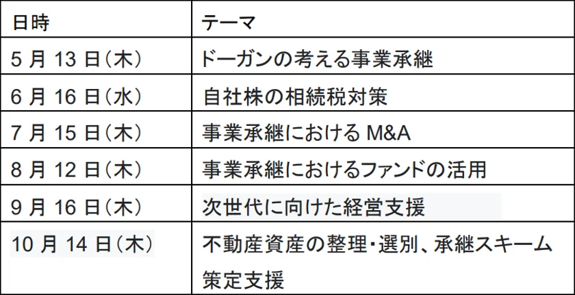 株式会社ドーガン(本社:福岡市、代表取締役:森 大介)は、九州における中小企業の事業承継問題に対応する「故郷のための事業承継相談窓口」( https://www.dogan.jp/ma )を立ち上げ、地域密着による中小企業支援を更に強化します。合わせて5月からスタートする無料のウェブセミナーへの参加者を募集いたします。