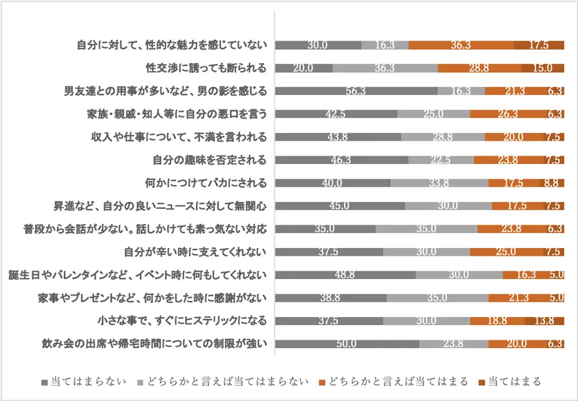 次いで、「家族・親戚・知人などに悪口を言われる(32.6%)」「自分が辛い時に支えてくれない(32.5%)」といった、「妻からの承認が少ない」状況であることが示唆されました(Q2参照)。