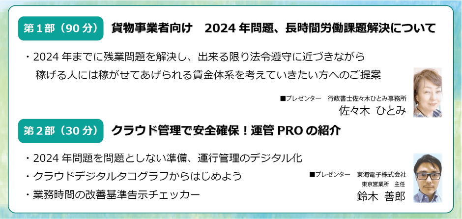 ■詳細はこちらから:【行政書士佐々木ひとみ事務所×東海電子合同ウェビナー】運送業界の2024年問題を解決へ導きます