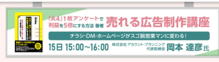 初日には、株式会社アカウント・プランニングの代表取締役・岡本 達彦氏が登壇。これまで総額100億円以上の広告展開に携わってきた販促コンサルのスペシャリストが、自身のベストセラー書籍「『A4』1枚アンケートで利益を5倍にする方法」をベースに、効果的な販促ノウハウを分かりやすく解説していきます。