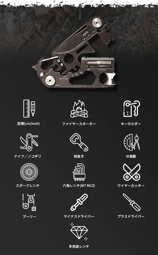 大きさが9cmx3.2cm、厚さ1.1cmと、クレジットカード程の超コンパクトサイズながら、30種類の機能を搭載。アウトドアはもちろん、日常のDIYや災害時も活躍します。オシャレなコンパクトなデザインでなので、ミニマリストや工具を置くスペースのない一人暮らしの方にもお勧めです。財布や衣類のポケットに入れてもスッキリ。キーホルダーにもなるので、車や家の鍵と一緒に持つこともできます。