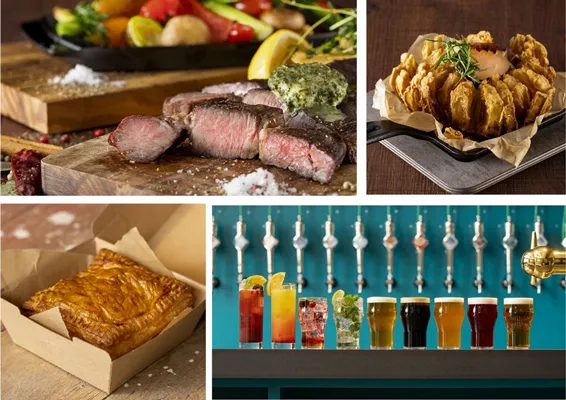 「ブラックアンガス牛ステーキ」や「季節野菜のグリル盛り合わせ」などの熱々のグリル料理は、世界各国のレストランやステーキハウスで高く評価されている名品炭火オーブン〈ジョスパー〉で焼き上げます。淡路島の玉ねぎを使用した「ブルーミングオニオンフライ」などひと手間加えた揚げたてのフライも、ビールと互いに引き立て合います。もちろんランチやテイクアウト・デリバリーメニューもご用意。いつでもコウベビアハウゼの味をお楽しみいただけます。