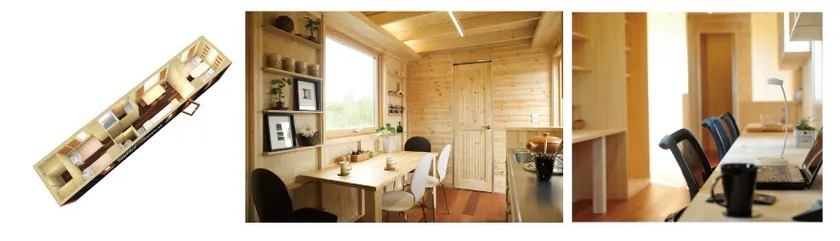 スマートモデューロは耐震性・断熱性・気密性・遮音性を兼ね備えた移動式木造住宅です。内装には無垢材を用いており、天然木の風合いが楽しめる住環境を実現します。