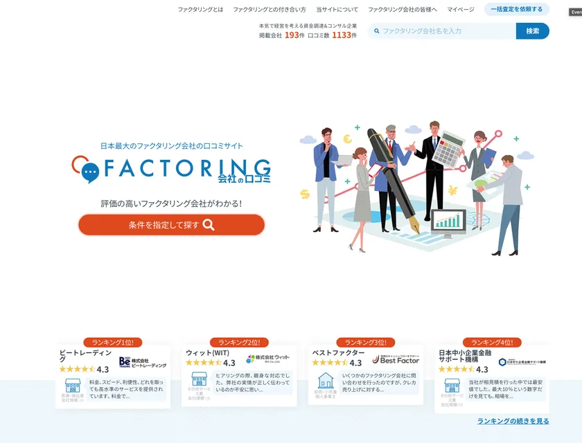 ファクタリングに関する情報格差を取り払い、フェアな取引を実現し、業界全体の活性化を図るため、「ファクタリング会社が伝えたい情報」と「サービスを利用した事業者が感じた情報」の両方が存在するリアルな声を反映した「ファクタリング会社の口コミ」サイトを運営しています。