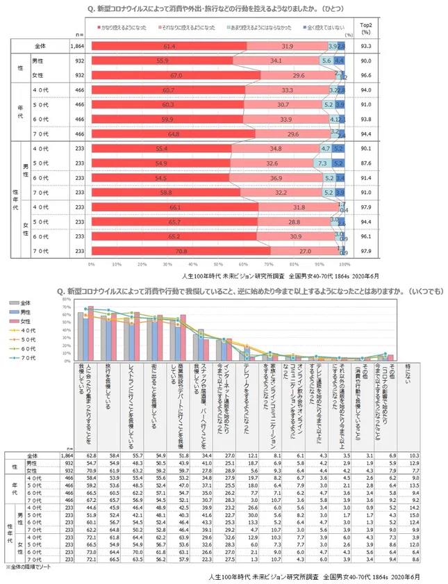 消費や外出・旅行などの行動を控えるようになりましたか、という質問には、40-70全体で、93.3%が控えたと答えました。男女別では女性が96.6%と相対的に高いといえます。年代別には、40代94.0%、50代91.0%、60代93.8%、70代94.4%と大きな差はなく、ひとしなみに行動を控えていることがわかりました。