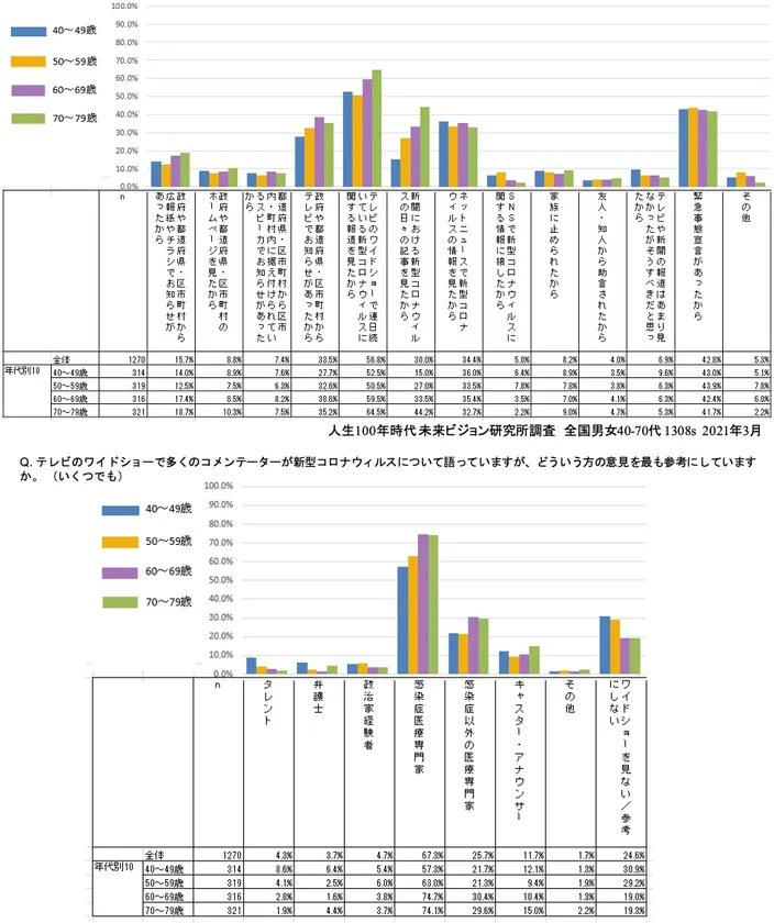 1位「テレビのワイドショー」は全体で56.8%と半数以上の人がそれによって行動を控えたとしていて、42.8%の2位「緊急事態宣言」を14%も上回りました。年代別にみると、「テレビのワイドショー」も「新聞記事」も70代が最も高いのですが、「テレビのワイドショー」に関しては、40代もやや高い、といえます。「ネットニュース」に関しては、40・50・60・70代と年代別にほぼ同レベルであることが特徴的です。「ワイドショー」で参考にしいるのは、「感染症医療専門家」が67.3%ときわめて高く、年代別には60・70代が74%と最も高くなっています。これは、その年代が新型コロナ感染により敏感だということにも起因していると思われます。