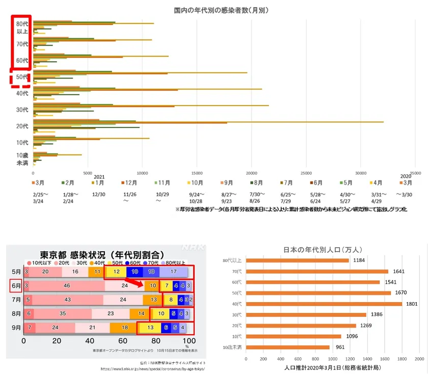 日本は、第一波、第二波、第三波を通じて、60代以上の感染者が少ないといえます。