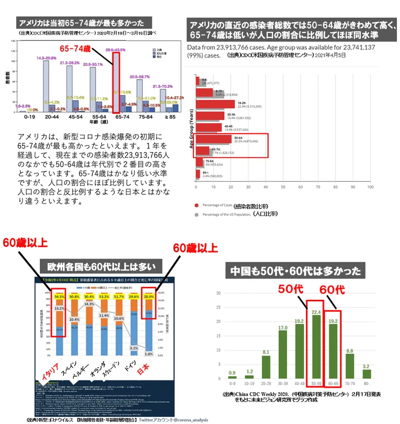 世界では、アメリカ、欧州各国、中国は50・60代ないし50・60代以上の感染者数が多い。
