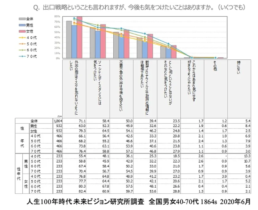ポストコロナで気をつけたいことの1位は「外出の際のマスク」71.1%、2位は「ソーシャルディスタンス」58.4%。ごく一部に高齢者のカラオケ感染が見られ話題にもなりましたが、圧倒的多数の中高年大人世代は、「マスク」と「ソーシャルディスタンス」というニューノーマルの基本的な行動を自発的にしようとしています。とくに女性が高いといえます。
