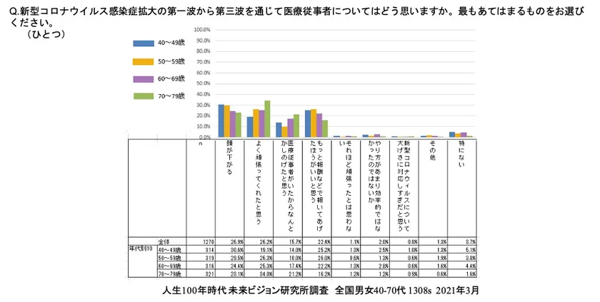 「頭が下がる」は年代が下がるほど上昇傾向にあり40・50代が最も高いといえます。これに対し、「よく頑張ってくれた」は、年代が上がるほど上昇傾向にあり、70代がとくに高いといえます。これは、40・50代が医療従事者と同年代であるのに対し、60・70代とくに70代は患者になりがちであり、その違いがでていると思われます。