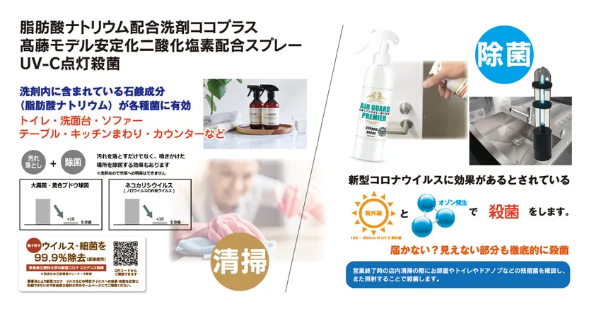 脂肪酸ナトリウム配合洗剤ココプラス 高藤モデル安定化二酸化塩素配合スプレー UV-C点灯殺菌