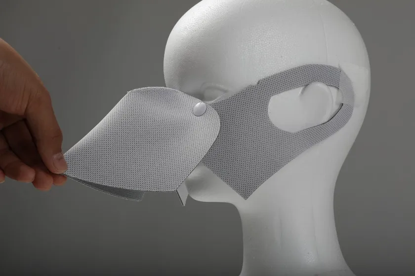 本製品は表生地・裏生地ともに抗菌生地を使用しており、100回洗濯しても抗菌効果が持続するリブフレッシュPスーパーを使用したウタマスク等の形状を変更し、発声時に大きく動く下あごへの接触をなくしたことでマスクが下部に移動しなくなりました。さらにそのマスクをカバーするようにもう1枚かぶせており、そのカバー部分が稼働します。飲食する場合はそのカバー部を上部に上げて飲食し、飲食が終わった際はそのカバー部を降ろすことで、飛沫を防ぎます。
