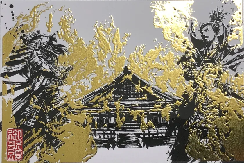 表面の墨絵は本能寺を囲む光秀を描く。裏面には明智桔梗の家紋を配したデザイン。水色桔梗を地としたカラーリングと、静かな闘志を感じる銀焔が美しい。